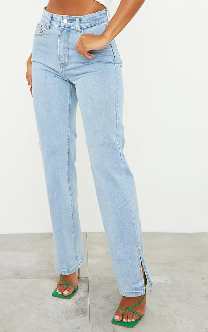We are obsessing over these jeans. Featuring a light blue wash denim material with a split hem design and a flattering fit. Finish off the look with a crop top and strappy heels for a weekend worthy vibe.