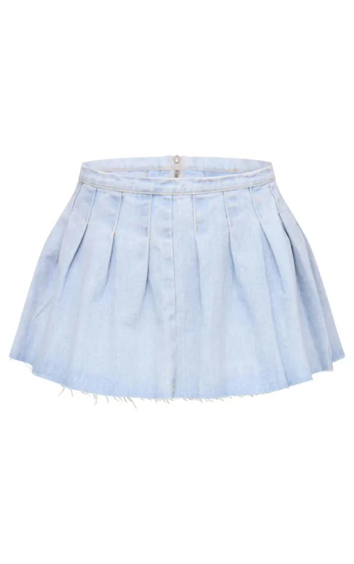 Prep your new season collection in style with this light blue wash low rise denim mini tennis skirt. We know it’s on everyone’s radars. It features a light blue denim material with a low rise waist and a figure-flattering fit, what more could you ask for? Style with the matching corset top, knee high boots and a blazer for the ultimate touch of chic that to be sure to catch the new season vibe.