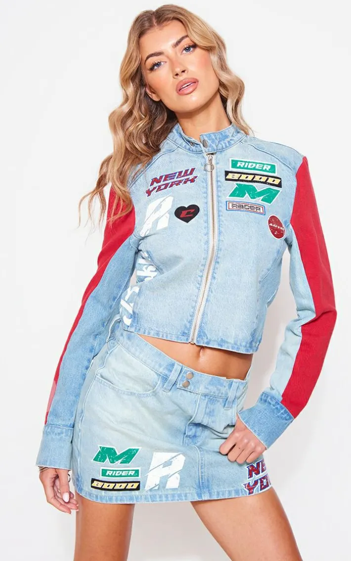 Add some edge into your denim collection with this light blue wash racer graphic denim mini skirt. This mini skirt is brought to you in a light blue denim wash material with a racer graphic and a mini length, what’s not to love? This mini skirt will have you setting serious trends wherever you step foot. Style effortlessly with the matching jacket, clear high heels and shoulder bag for an insta-worthy combo.