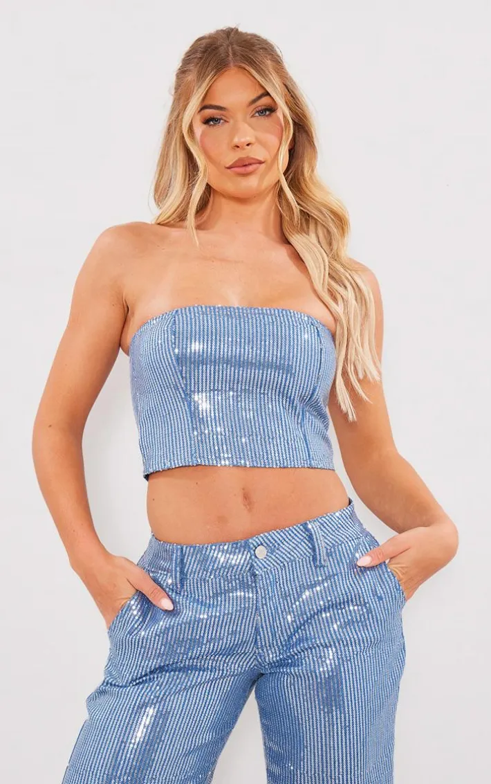 Take your wardrobe collection to a whole new level with this light blue wash sequin bandeau top. This bandeau top is brought to you in a light blue hue with sequin detail and a bandeau design, how could you turn this down? This bandeau top is everything you need for your weekend wardrobe. So what are you waiting for? Shop the look and opt for the matching bottoms with high heels and accessories for a flawless finish.