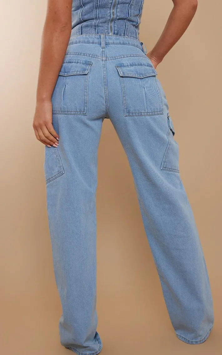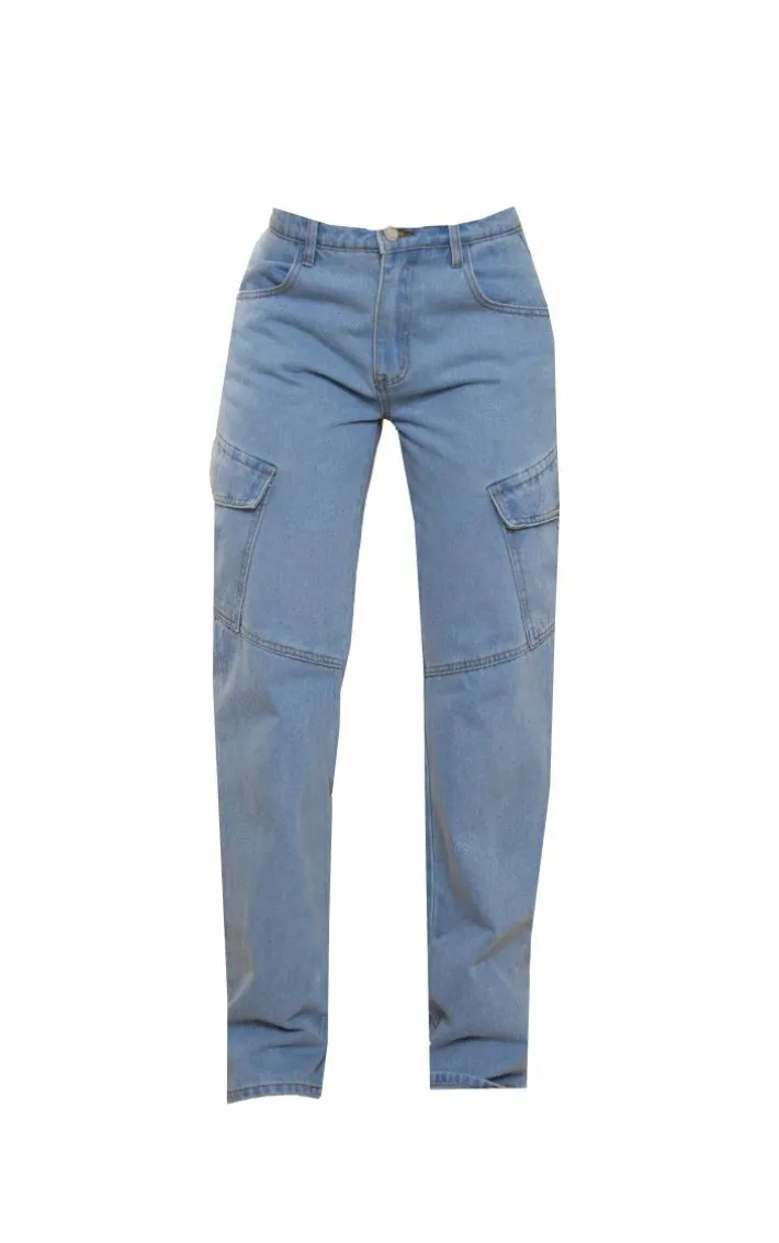 We are obsessing over these light blue wash slim fit cargo pocket boyfriend jeans. These jeans are sure to have heads turning wherever you go. With a light blue wash, these jeans are easily dressed up or down depending on the occasion. These jeans have a slim fit design and a cargo pocket detail, we are seriously obsessed. Style with a matching denim top and some of your fave heels to take your look to the next level.