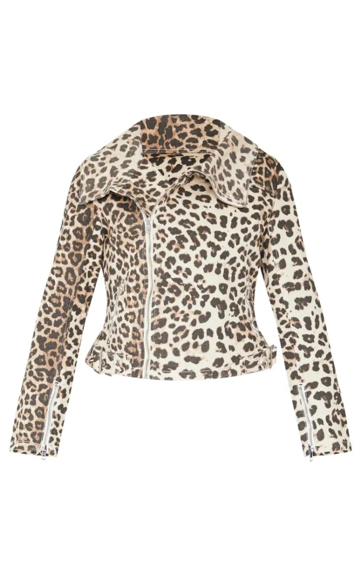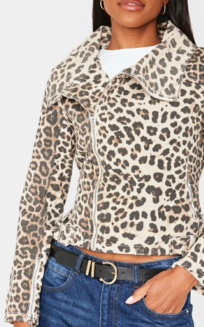 This light brown leopard print biker style denim jacket is at the top of our new season hit list. Brought to you in a light brown denim material with a leopard print design and a zip through fastening, how can you resist? It’s biker style is sure to add an edge to any look. Style this light brown jacket with a crop top, hot pants and chunky boots for a look we’re obsessed with.