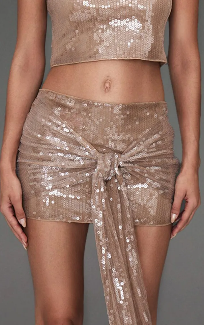 Make weekend styling easy with this light brown sequin ruched drape micro mini skirt. Brought to you in a staple light brown shade, with sequin detailing, a ruched material and drape design. Throw this on with the matching top and a pair of heels to stand out. It’s a yes from us.