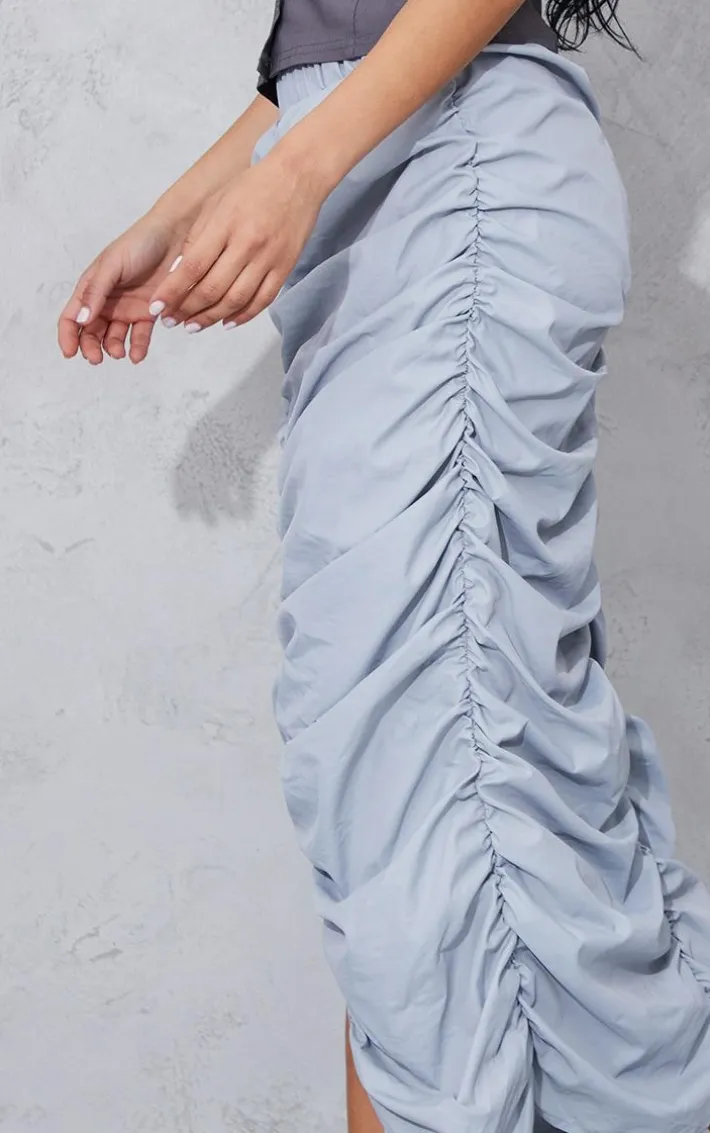 Add some edge to your new season wardrobe with this light grey shell ruched cargo midi skirt. Brought to you in a light grey shell material with ruched detailing, a cargo style and a midi length, how could you resist? This versatile midi skirt is perfect for your AM to PM styling. Shop the look and pair this with a grey corset, box-fresh kicks and accessories for an everyday look like no other.