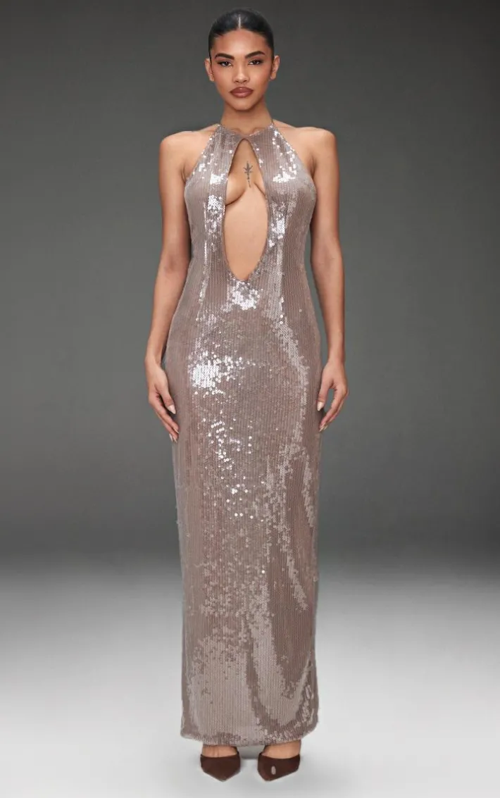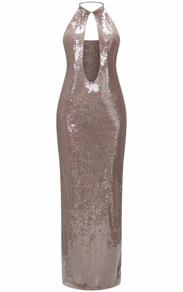 Shopping for a chic evening dress? We’ve got you covered with this light nude sequin high neck plunge maxi dress. Featuring a bold plunge neckline and light nude sequin fabric, this maxi dress will have you stepping out in style. Take the look to new heights with your best pair of heels and silver jewelry.