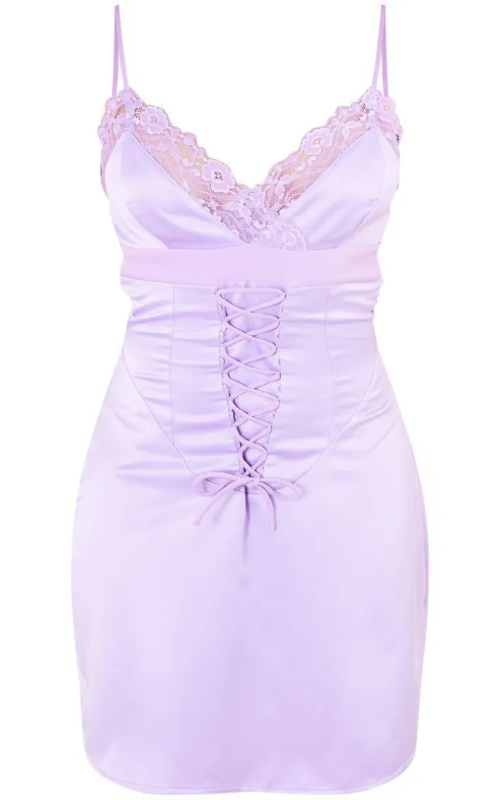 Get your weekend glam on with this lilac satin lace trim strappy shift dress. This shift dress is brought to you in a lilac satin material with a lace trim and a strappy design, what’s not to love about this? This shift dress is here to banish any of your what-to-wear dilemmas. Pair with your dreamy high heels and accessories to level up the look.