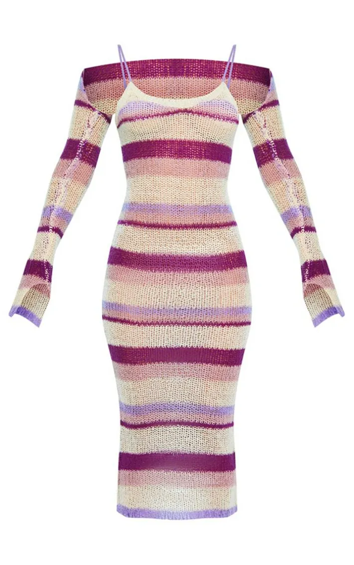 We are all about knit this season and this lilac stripe open knit maxi dress and sleeves is at the top of our new season wish list. Made from a lilac hue open knit material with a stripe design and matching sleeves, we are so obsessed. It’s flattering maxi style is sure to show odd your shape in all the right places. Just add strappy heels and statement accessories for a look that will turn heads.