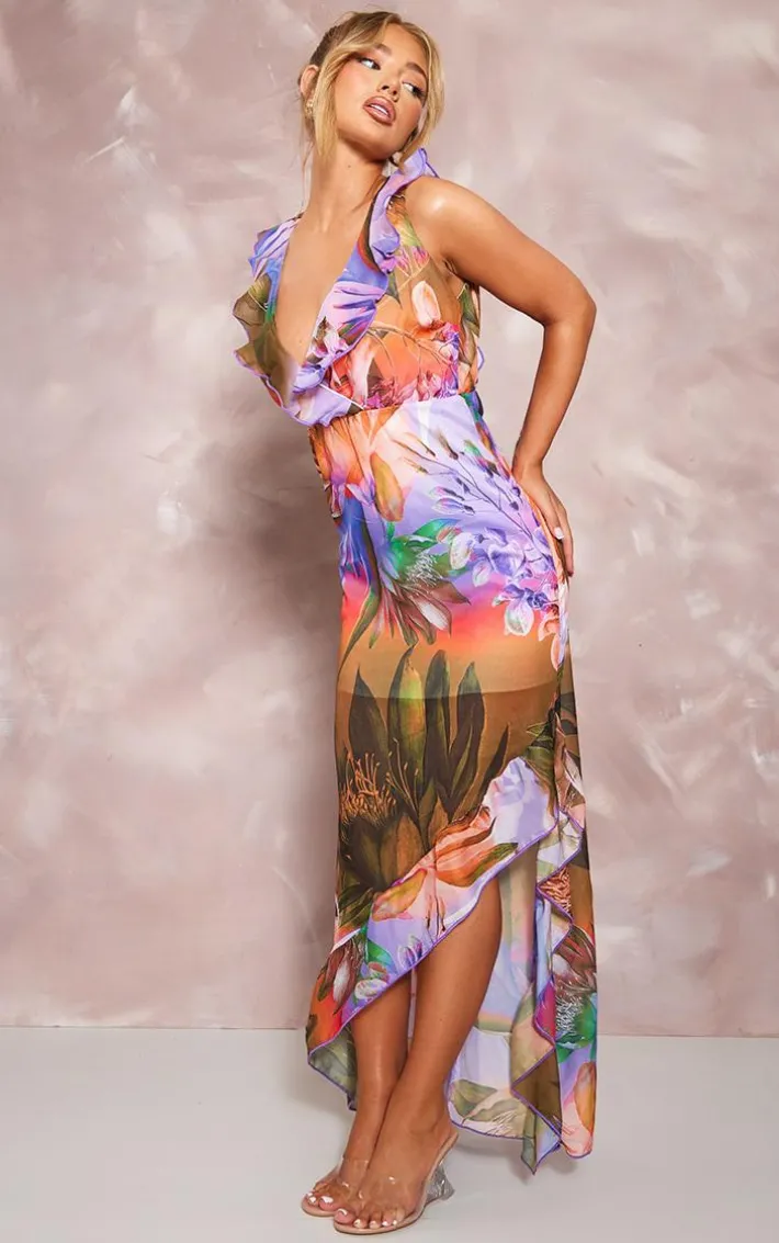 Be sure to turn heads in this lilac tropical frill trim plunge maxi dress. Brought to you in a lilac hue material with a dreamy tropical print design, a plunging neckline and frill trim detailing, what more could you really need? In a figure-flattering maxi fit, this is definitely as dress to be remembered. Just add clear strap heels and gold accessories for a flawless finishing touch.