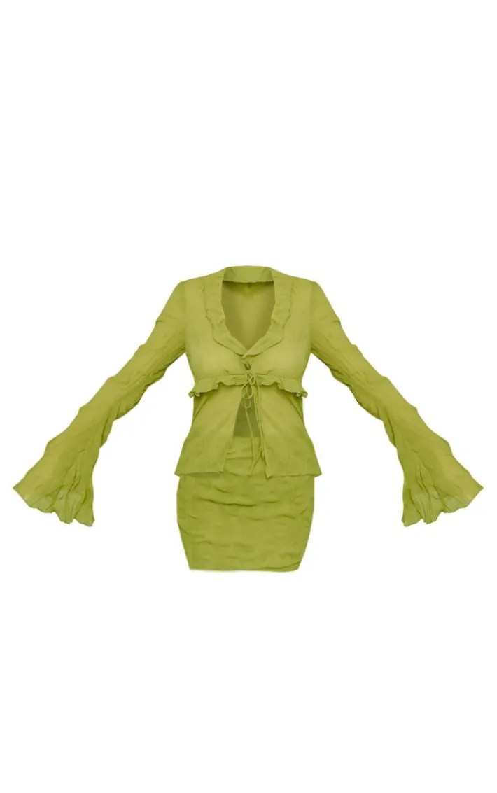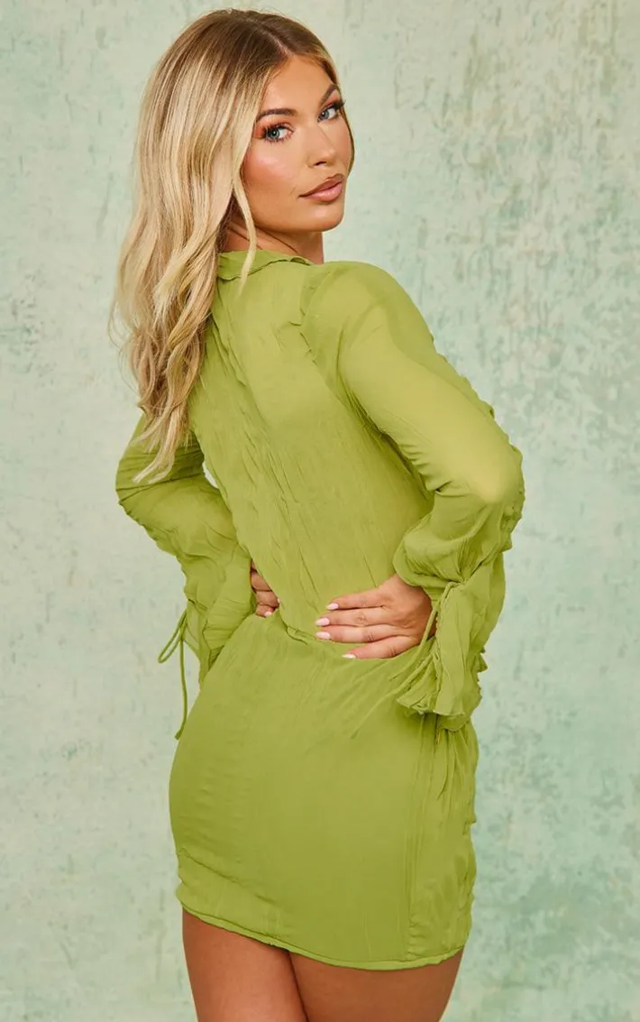 Meet your new weekend style saviour with this lime crinkle chiffon tie detail flare sleeve bodycon dress. Brought to you in a lime hue crinkle chiffon material with tie detailing, log flared sleeves and a flattering bodycon fit, how can you not be obsessed? Style this bodycon dress with slip-on heels and a mini bag for an effortlessly chic look that is sure to make you stand out from the crowd.