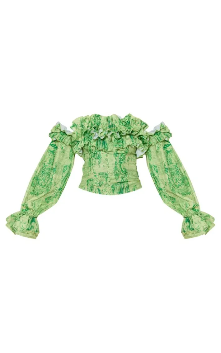 Get maxing out your wardrobe with this lime renaissance print ruffle hem off shoulder long sleeve blouse. This unreal blouse is all you need to have all eyes on you. With a lime material with a renaissance print, what’s not to love? With a ruffle hem and an off the shoulder design, this long sleeve blouse will have you tapping into your confident side. Team with some clear heels and your fave accessories to finish off the look.
