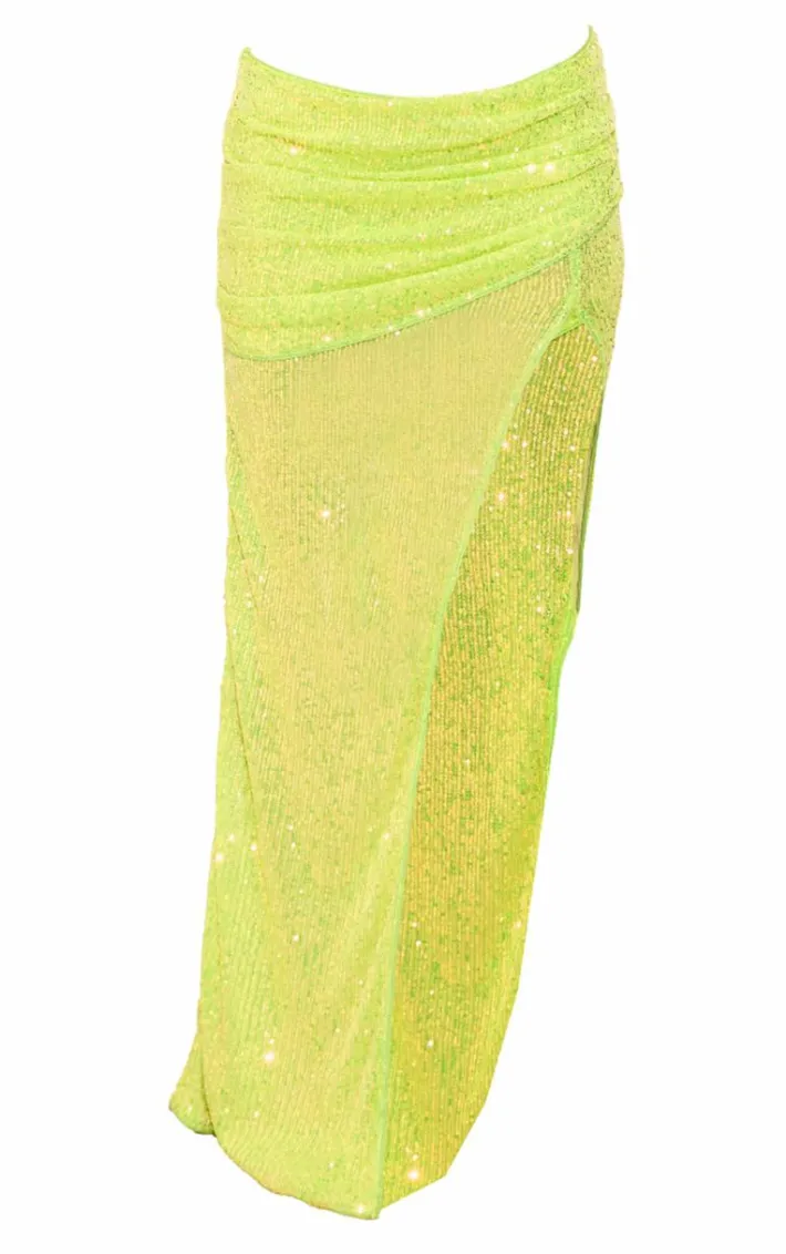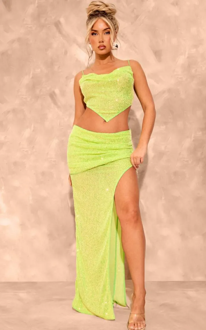 Create a look no one will forget with this lime sequin fold over split leg maxi skirt, we’re seriously in love. This skirt features a lime hue material with sequin detailing and a fold over design, it is perfect for your next event. Style this sequin skirt with the matching top, clear slip-on heels and gold statement earrings for a flawless finish.