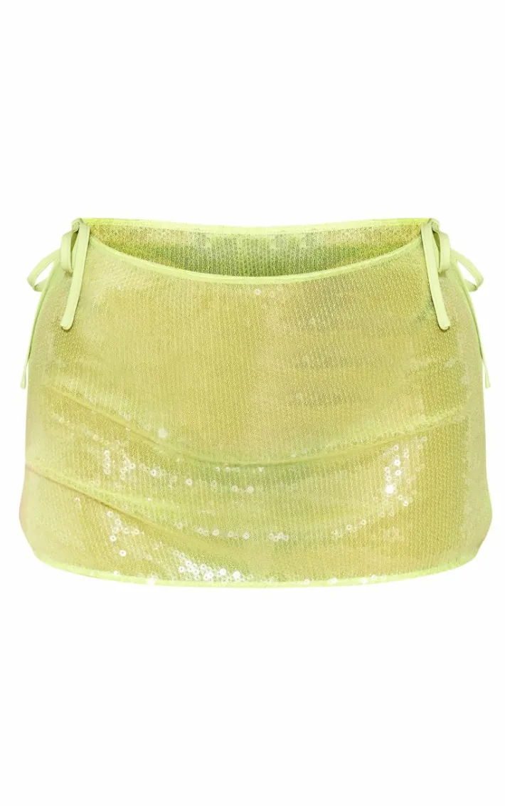 You won’t blend in with this lime sequin sheer tie up micro mini skirt. Brought to you in a lime sheer material with a sequin design, what more could you want? This mini skirt has a micro mini length and a tie up detail giving you a flattering fit like no other. Team with the matching corset and your fave heels to finish off the look.