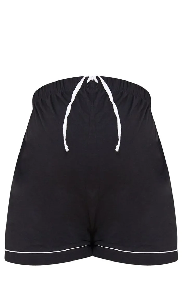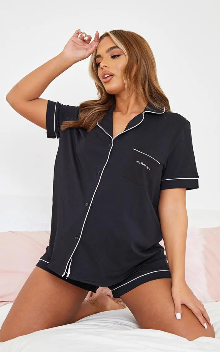 We are loving these must-have maternity black mama pajama shorts for your new season Sleepwear collection. They’re made using a black material with white piping detailing and a comfy fit. Team with the matching top, comfy slippers and a satin gown to finish.