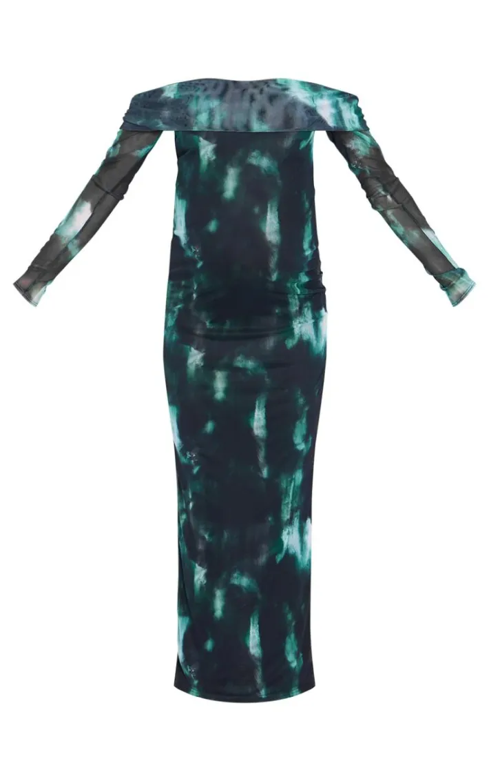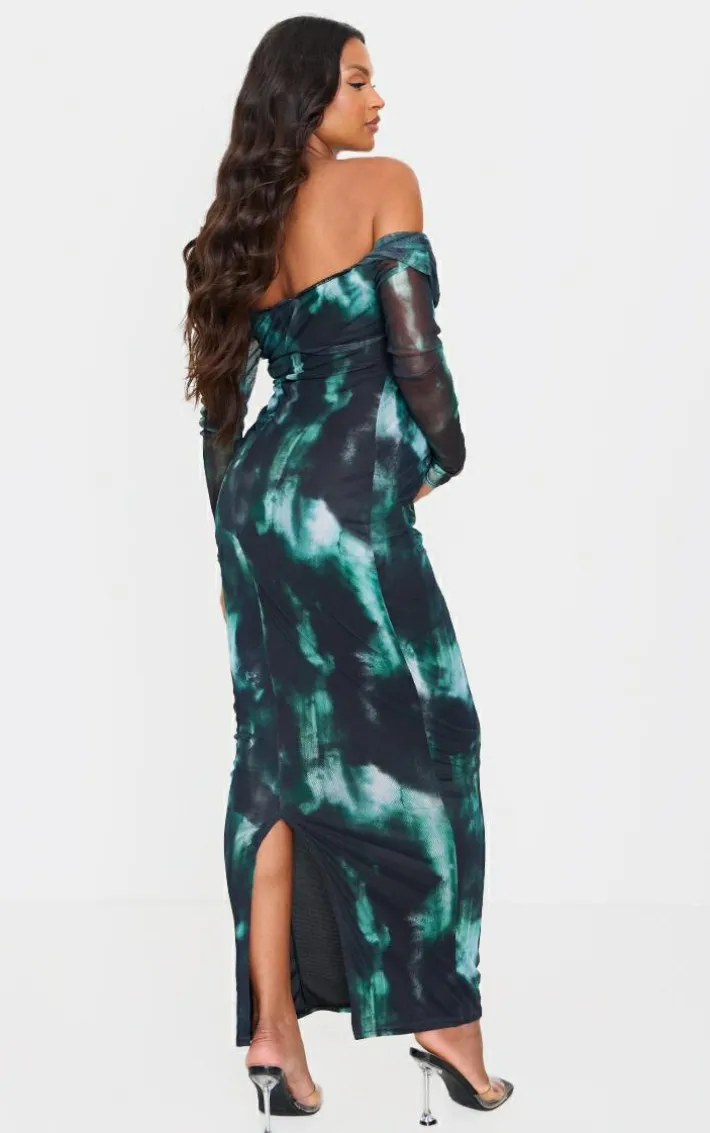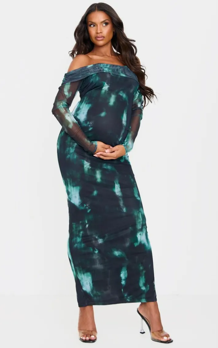 Your what to wear dilemmas are solved with this maternity black printed mesh bardot long sleeve maxi dress. Its black printed mesh fabric, bardot neckline and maxi dress length are made for your next big event. Work your styling technique and add a pair of clear toe heels and silver jewelry to finish the look.