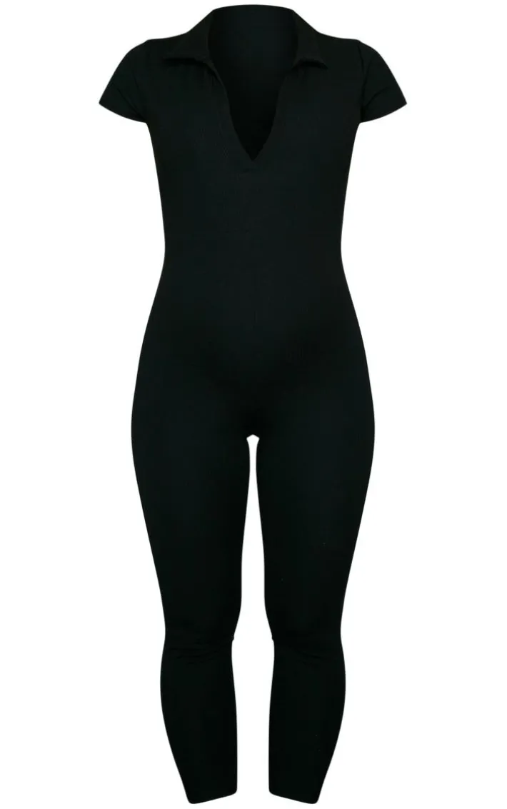 Take the stress out of everyday styling with this maternity black rib collar short sleeve jumpsuit. Seriously comfy and perfect for dressing up or down, this jumpsuit is sure to be a staple in your maternity wardrobe. Made from a black rib material with short sleeves, a collar and a figure-hugging fit, what’s not to love? Just add fresh kicks and your go-to accessories for an effortless off-duty look.