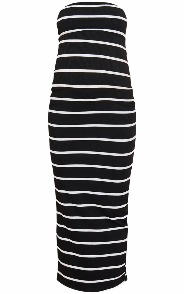 Dress the bump in style with this maternity black striped bandeau maxi dress. Brought to you in a black striped material with a bandeau neckline, this maxi dress is a dream. Style with white sandals and gold accessories for a yummy mummy look.