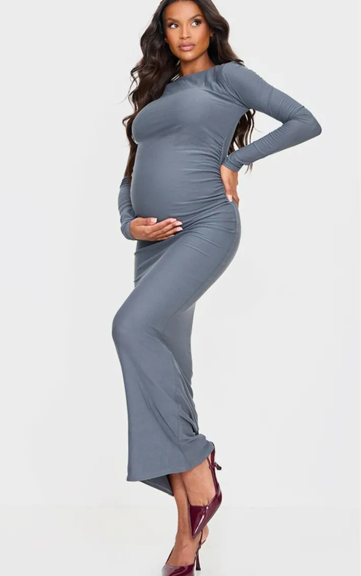 You won’t have to sacrifice style for comfort with this maternity charcoal soft touch double layered ruched maxi dress. Brought to you in a versatile charcoal hue, with a soft touch material an double layered design for extra support. Style with a pop of red in your heels and shoulder bag for a style worthy of the season ahead.