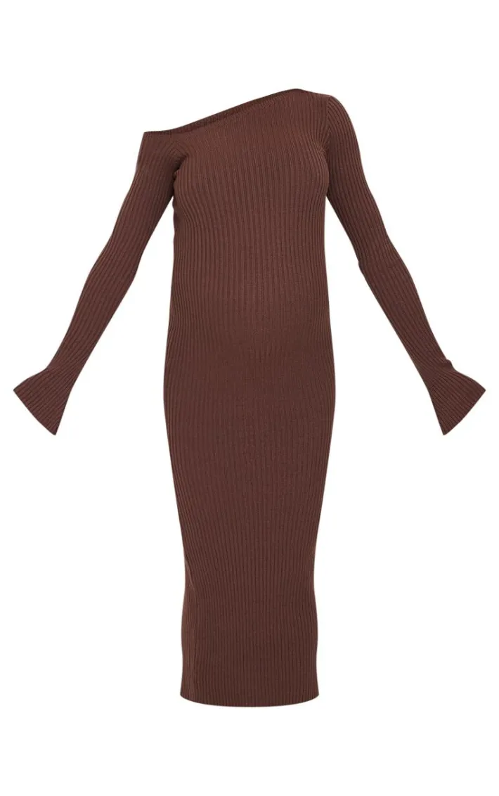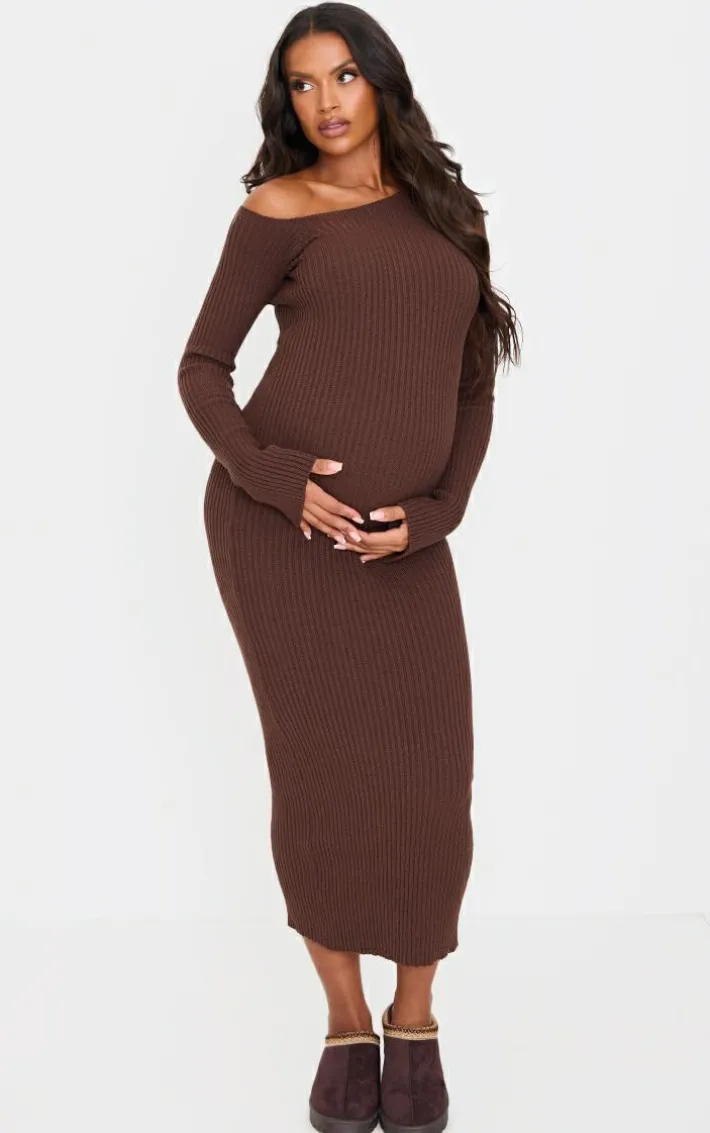 Work your styling techniques to make this maternity chocolate asymmetric long sleeve rib knit maxi dress perfect for any occasion. Brought to you in a chocolate hue rib knit material with an asymmetric design, long sleeves and a bump-hugging maxi fit, you really can’t go wrong. Style this maxi dress with comfy shoes and simple gold accessories for an everyday look like no other.