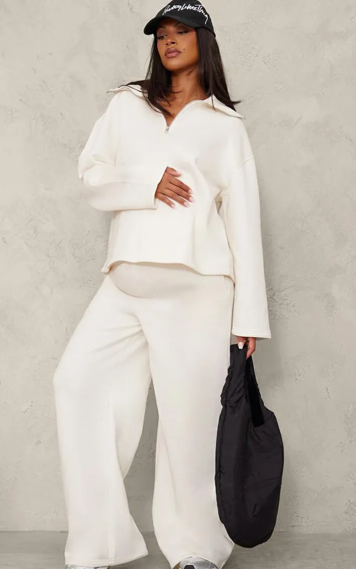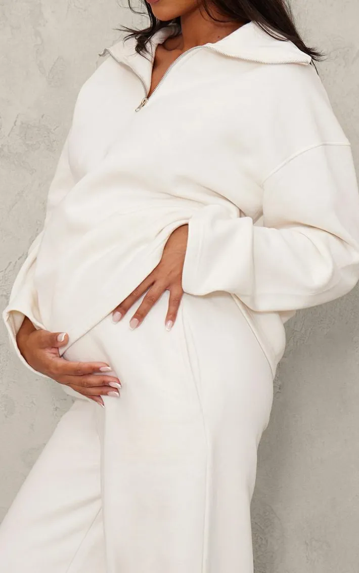 Introducing your new season staple with these maternity cream wide leg sweatpants. Brought to you in a cream hue material with a wide leg fit, these sweatpants are everything you need and more. Style with the matching Sweatshirt, fresh kicks and black accessories for a chic off-duty finish we’re loving.