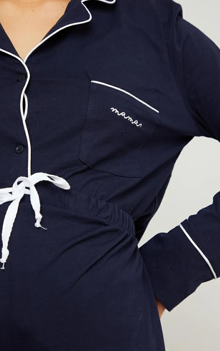 Keep your sleepwear look seriously chilled in this maternity navy mama long sleeve button up PJ top. It is made using a navy hue material with a ‘Mama’ print and long sleeves, what’s not to love? Team this maternity PJ top with the matching bottoms and comfy Slides to complete the look.