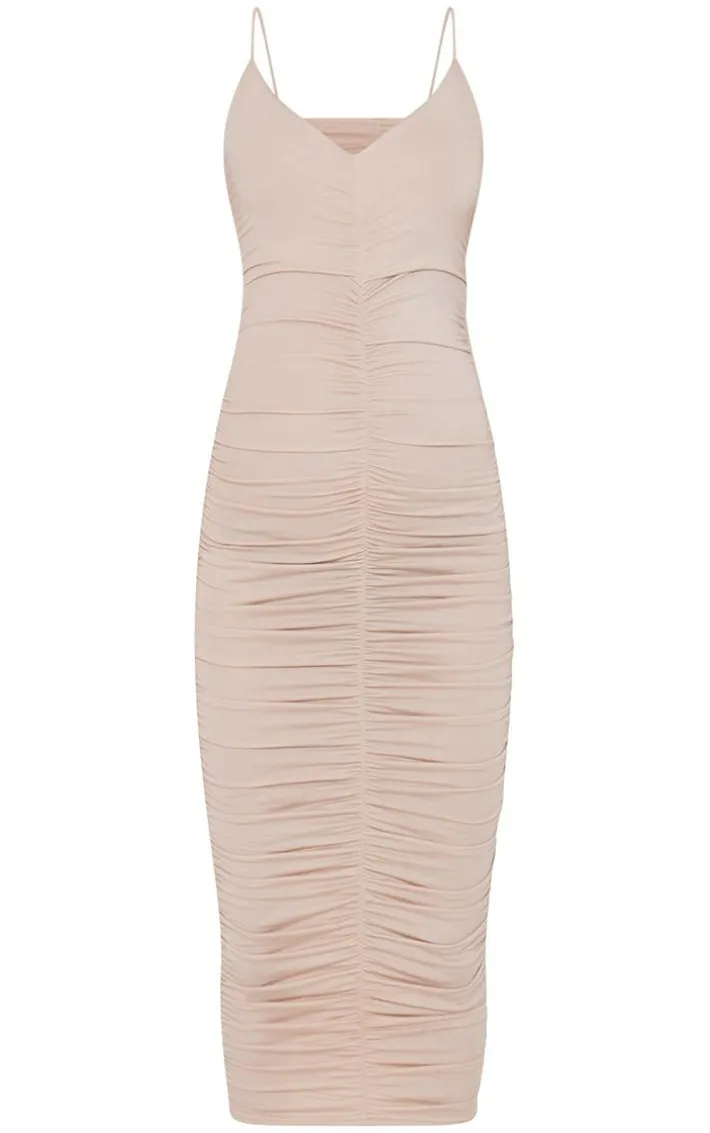 Inject some neutral hues into your look with this midi dress. Featuring a stone contour jersey material with a plunging neckline and ruched detailing, it’s perfect for that upcoming occasion. Style with strappy heels and simple accessories to complete the look.