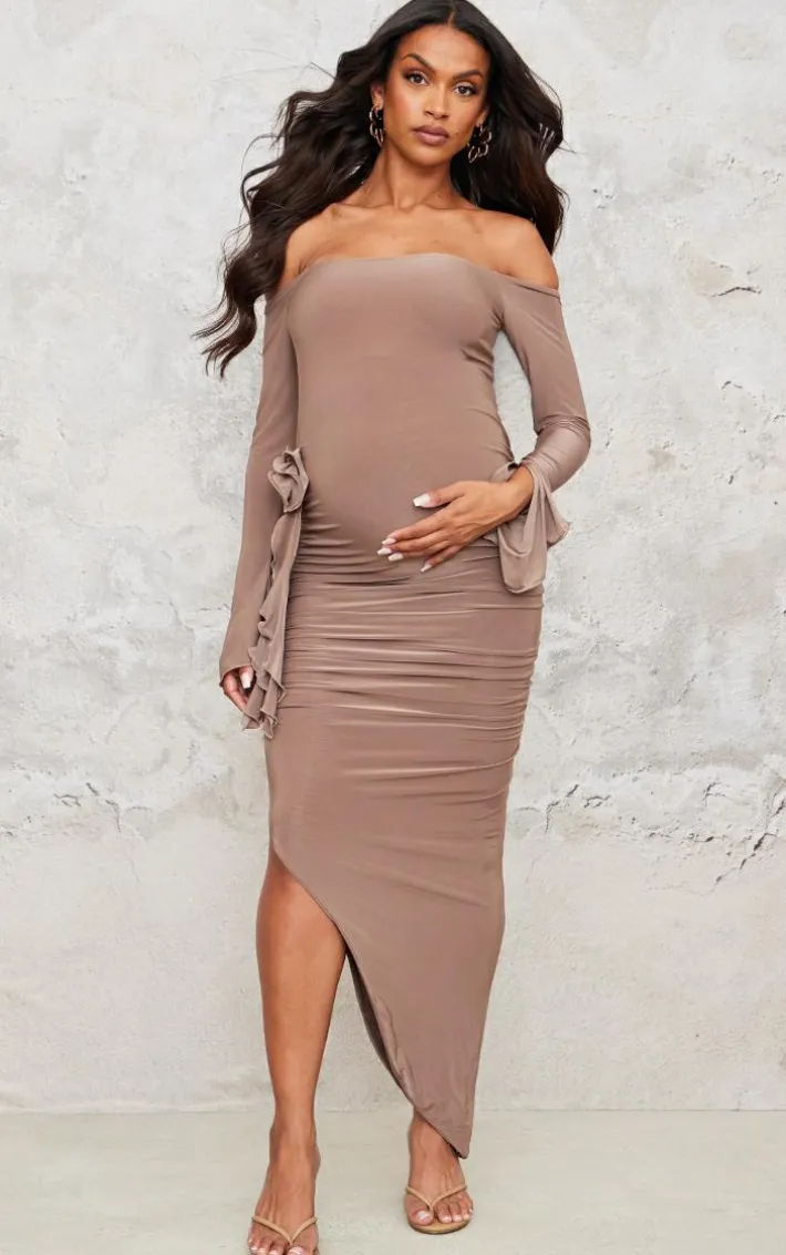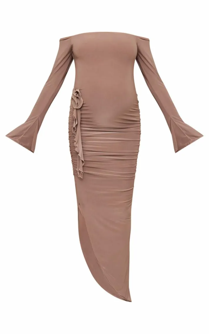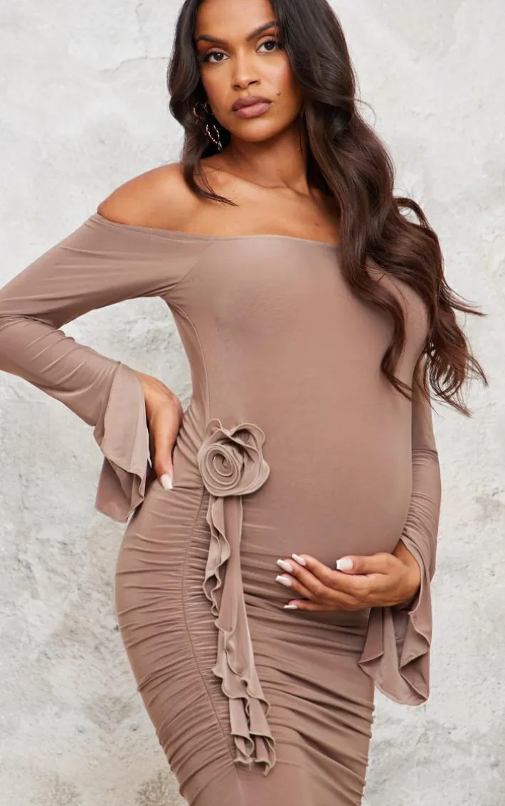 Unsure what to wear for your next big event? Look no further than this maternity taupe slinky off the shoulder flower detail maxi dress. Made with a glam taupe hue, off the shoulder fit and side flower detail, we are obsessed. Why not pair with some slip on heels, statement gold earrings and your go-to accessories?