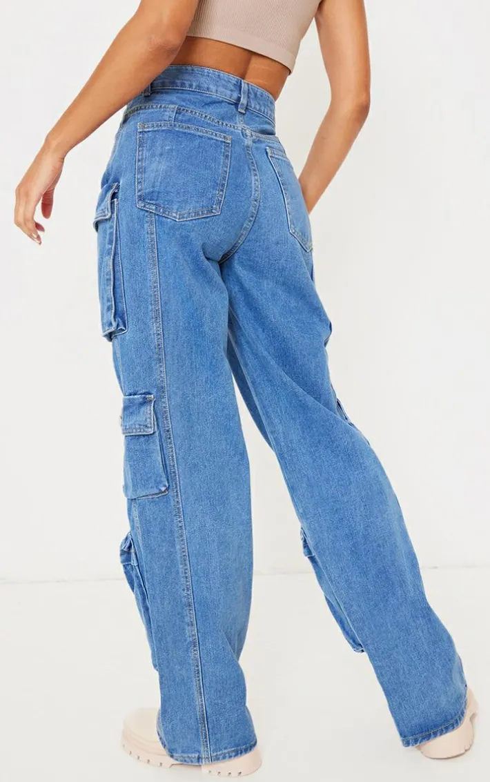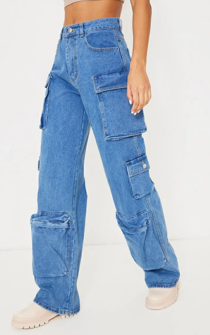 Meet your new season wardrobe essential with these jeans. Featuring a mid blue wash material with cargo style pockets and a wide leg fit. Wear with a crop top, a puffer jacket and chunky boots for the ultimate off-duty combo.