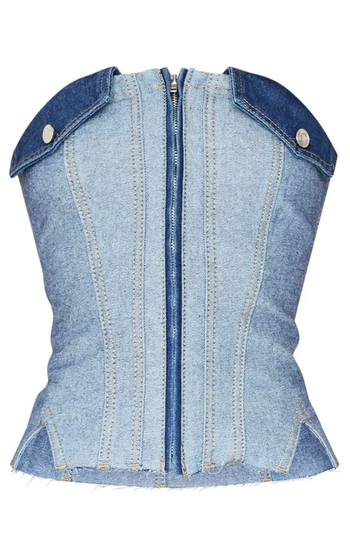 We’re all about a fierce denim ‘fit, so why not add this mid blue wash contrast panel denim crop top into your new season rotation? Whether you’re going out during the week or weekend, you’ll look flawless with its contrasting panel pocked design, zip down front and crop top fit. Double up on the denim with matching blue wash jeans and a pair of heels to complete the look.