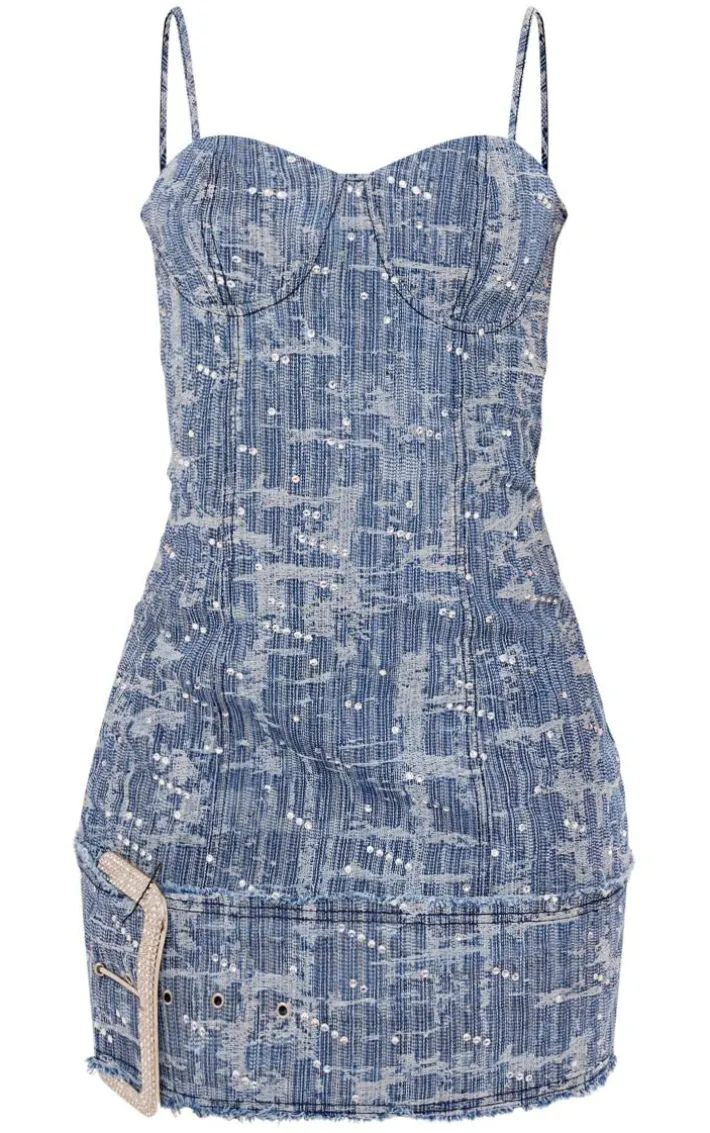 The weekend is here and this mid blue wash diamante buckle textured denim mini dress is here to nail the dress code. With a mid blue wash textured denim material, diamante buckle detail and a strappy design, how could you not be in love? This mini dress hugs your figure in all the right places and is sure to steal all the attention in the room. Simply add your fave heels and glam accessories for a flawless finish.