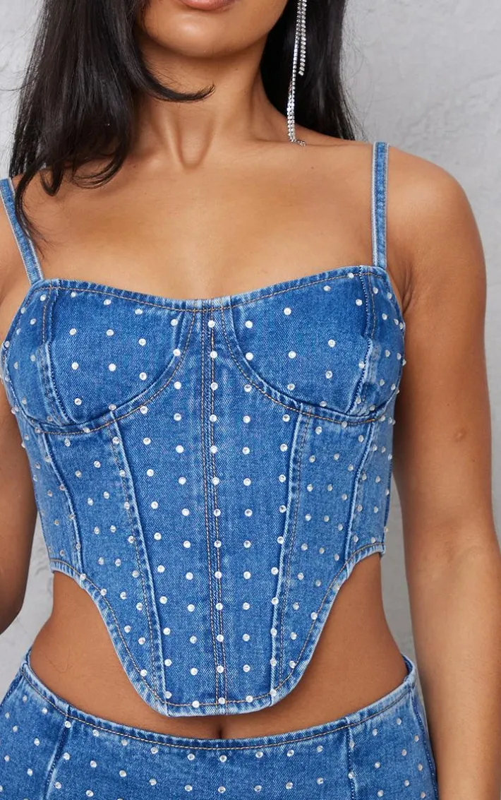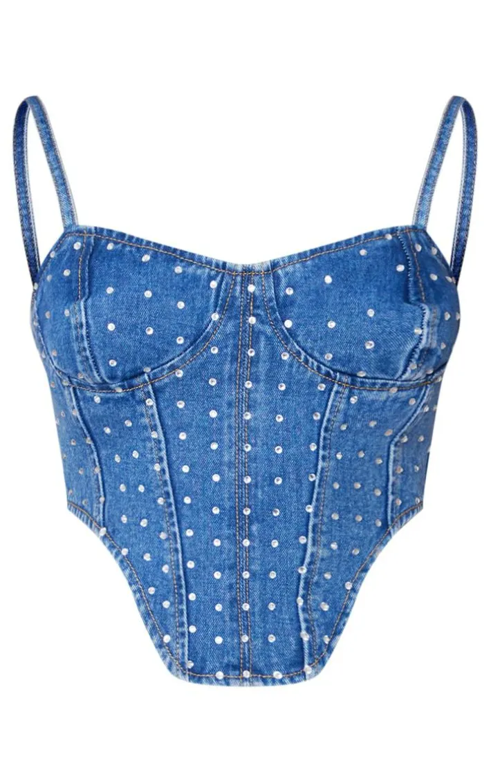 Add some glam vibes to your denim collection with this staple corset top. Featuring a mid blue wash denim material with diamante detail, zip fastening and a figure-flattering fit, we’re obsessed. Team it with the matching skirt and heels for an eye-catching combo.