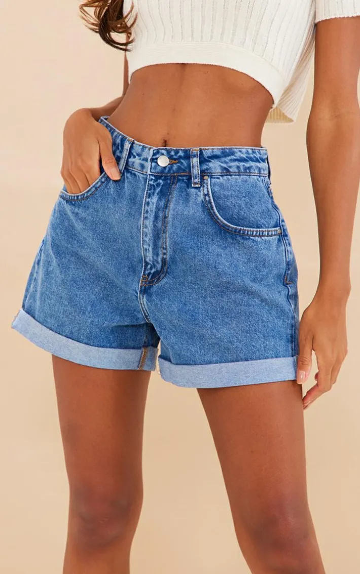 Get ready to update your wardrobe for the new season with these mid blue wash foldover hem denim mom shorts. Made from a mid blue wash denim material and in an on-trend mom style with fold over hem detailing, these denim shorts are sure to be a staple in your wardrobe. Simply style these mom shorts with a crop top and fresh kicks for an off-duty look we’re loving.