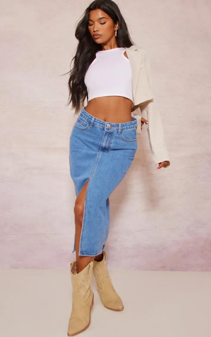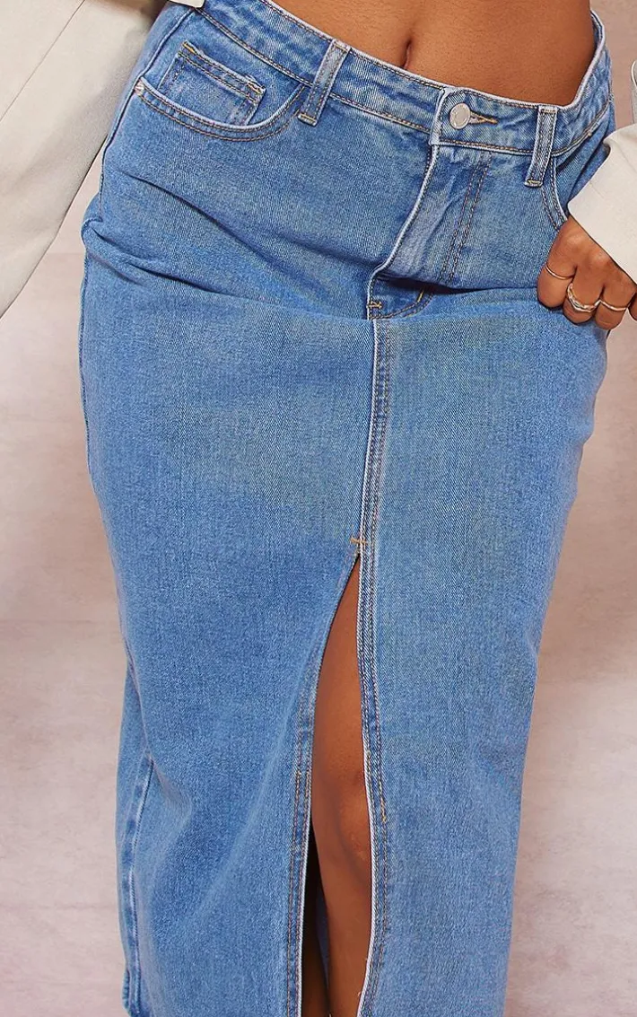 Nail all the major trends this season with this mid-blue wash split front mid-rise denim midi skirt. Brought to you in a mid-blue wash denim material with a split front and a mid-rise waist, what’s not to be obsessed with? We’re loving a denim midi skirt this season and is at the top of the new trends hitlist, how could you say no? Team with a basic crop top, a cropped blazer and western boots for a flawless finish.