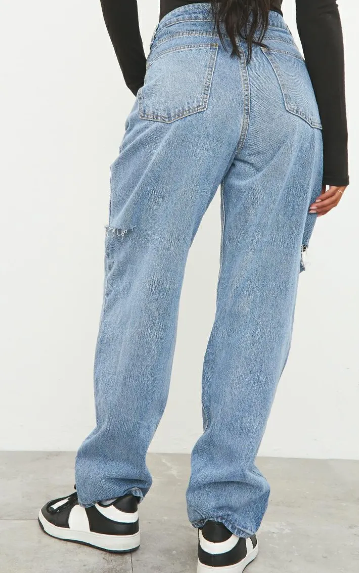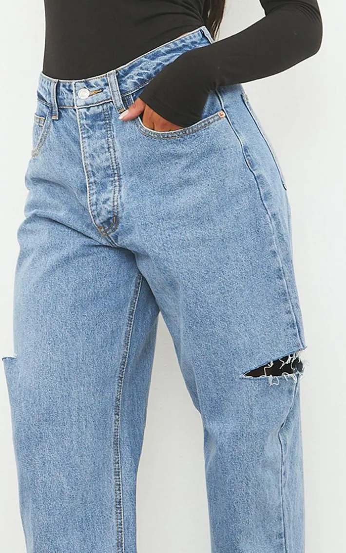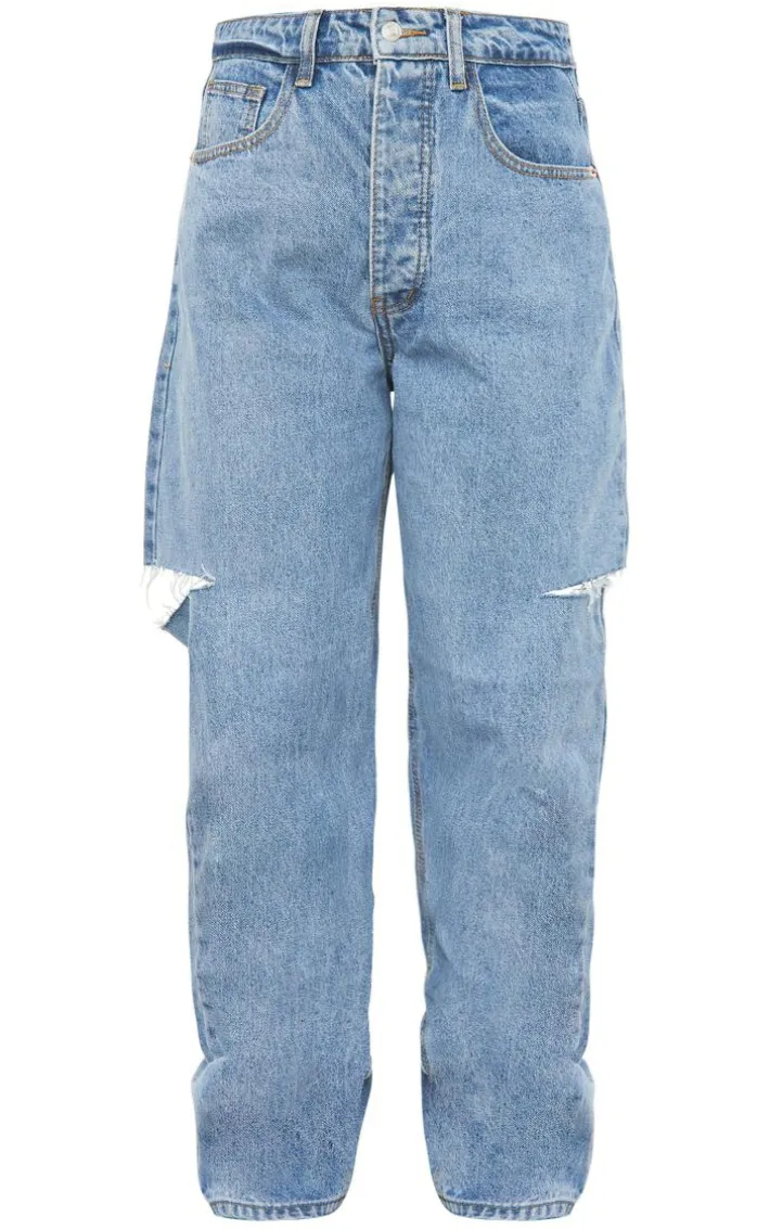 Add some grunge to your new season wardrobe with these boyfriend jeans. Featuring a mid wash denim material with a baggy boyfriend fit and a thigh split detail. Team this with a crop top and fresh kicks to earn some instant style points.