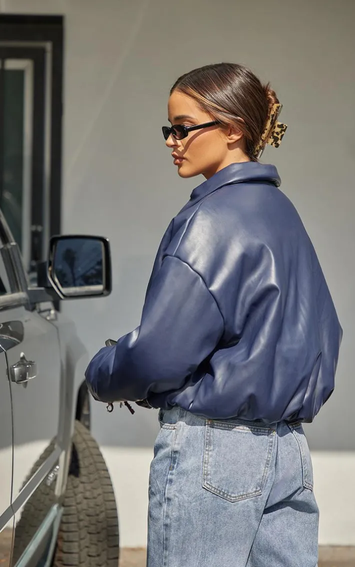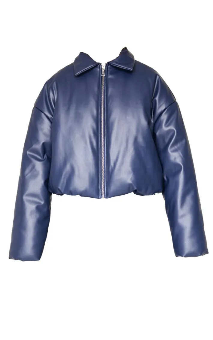 Make styling easy this cold weather season with this midnight blue faux leather collar detail puffer jacket. Brought to you in a midnight blue hue faux leather material with a collar detail, this puffer jacket is all the new you need. Pair over a chic outfit of the day for an elevated look perfect for those days out.