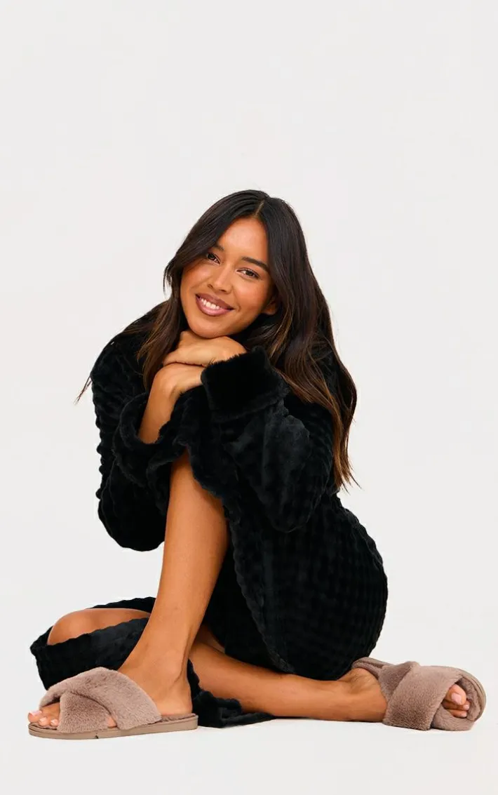 For a chilled night in, opt for these mink faux fur cross over slippers. Brought to you in a luxe mink shade, with a cosy faux fur material and a cross over design, what’s not to love? Style these with a comfy black robe for a look that you won’t want to take off.