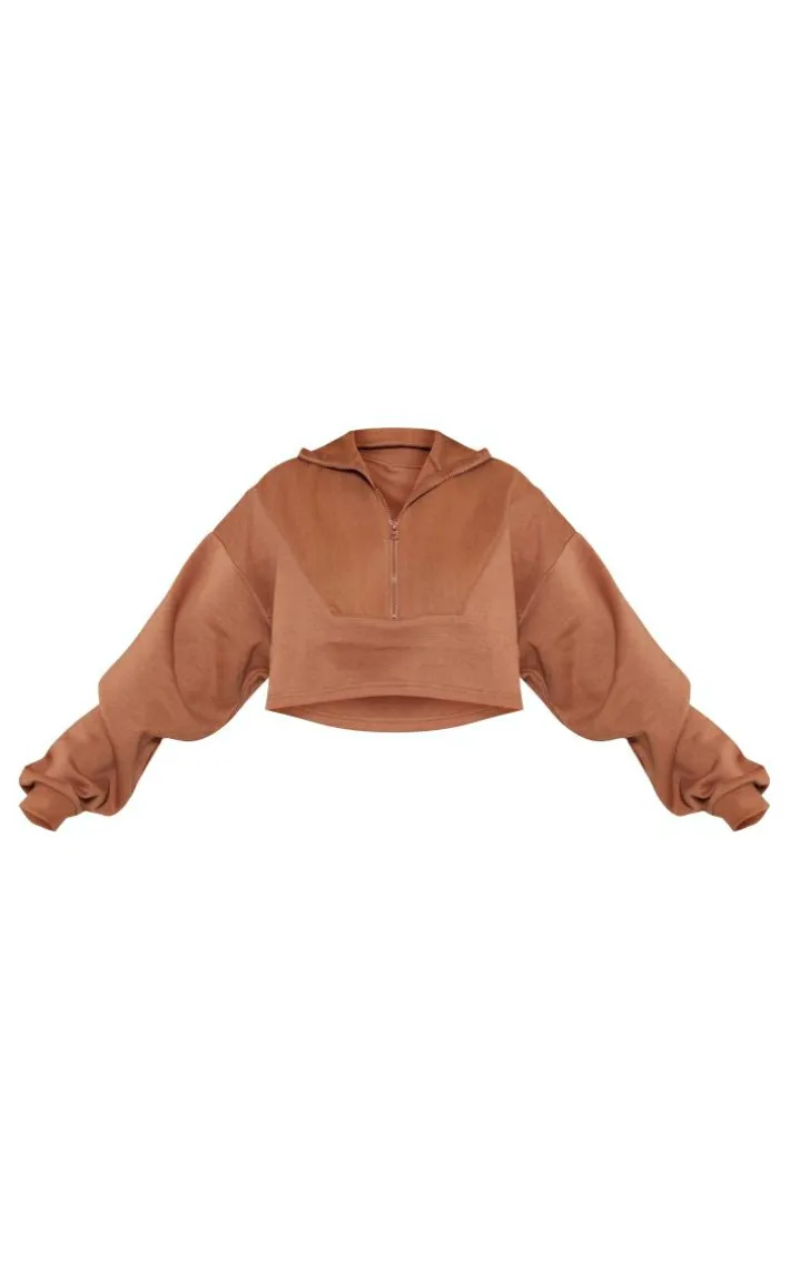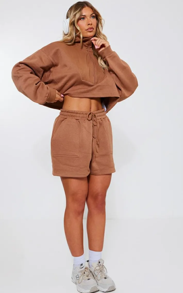 Cosy season is here and you need this mocha contrast oversized quarter zip sweatshirt for your off-duty wardrobe. Made from a mocha contrast material with an oversized fit and a quarter zip detail, how could you not be in love? This sweatshirt is the ultimate addition to your wardrobe and will be that one piece you keep reaching for time after time. Style seamlessly with the matching shorts, comfy shoes and gold accessories for a fool-proof finish.