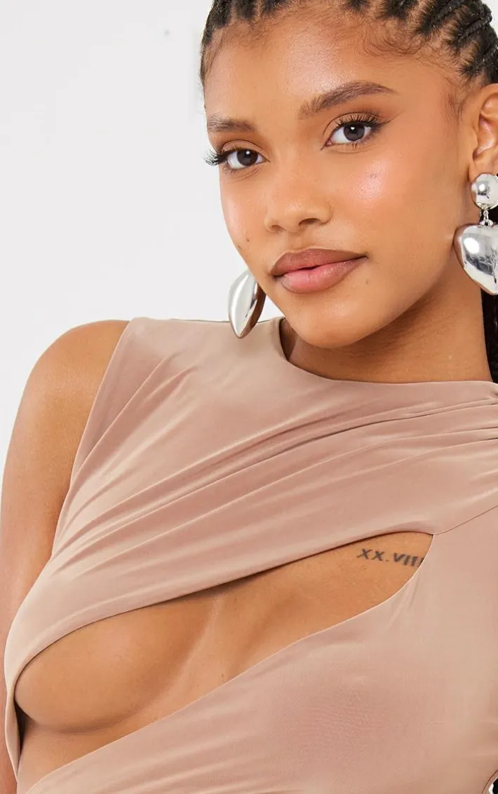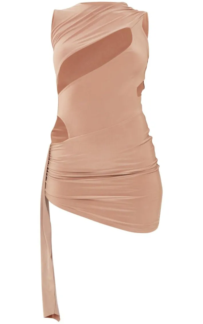 Be prepared to steal all the attention this weekend with this mocha extreme cut out knot detail slinky bodycon dress. Made from a mocha slinky material with a cut-out design and knot detail, how could you say no? This bodycon dress is sure to turn heads for all the right reasons and we know you won’t be able to resist adding it to your basket. All you need to do is add clear heels and your fave accessories for a showstopping finish.