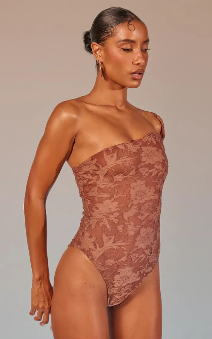 We’re totally in love with this mocha floral sheer burnout asymmetric twist detail strap bodysuit for your weekend plans. It is made from a mocha floral sheer burnout material with twist detail and a strappy design, how could you not be obsessed? This bodysuit gives you endless styling potential and is bound to give your look that extra chic touch. Style seamlessly with the matching mini skirt, clear heels and gold accessories for a seriously luxe finish.