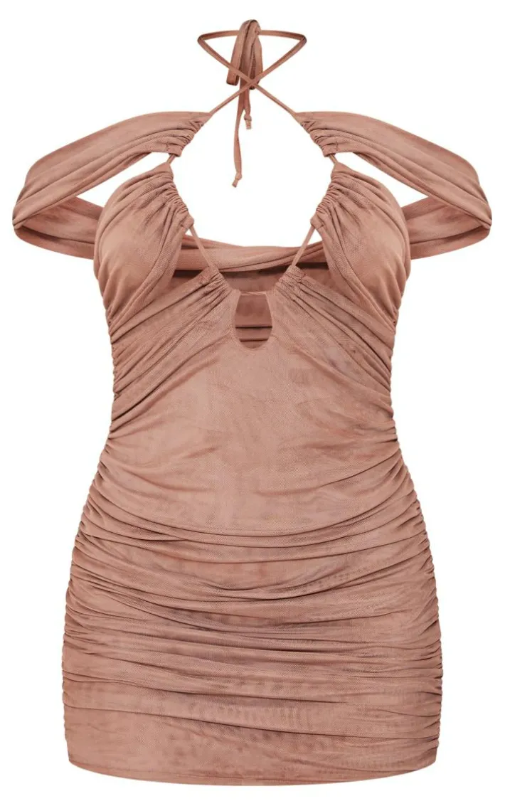 Your weekend styling dilemmas are finally solved with this mocha ruched cut out bardot bodycon dress, get ready to have heads turning for all the right reasons. Made using a mocha hue material with a cut out design and ruched detailing, you won’t be able to resist. Team this bodycon dress with clear slip-on heels and gold hoop earrings for a look everyone will want.