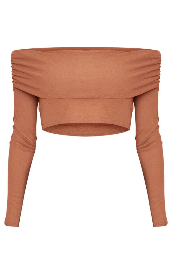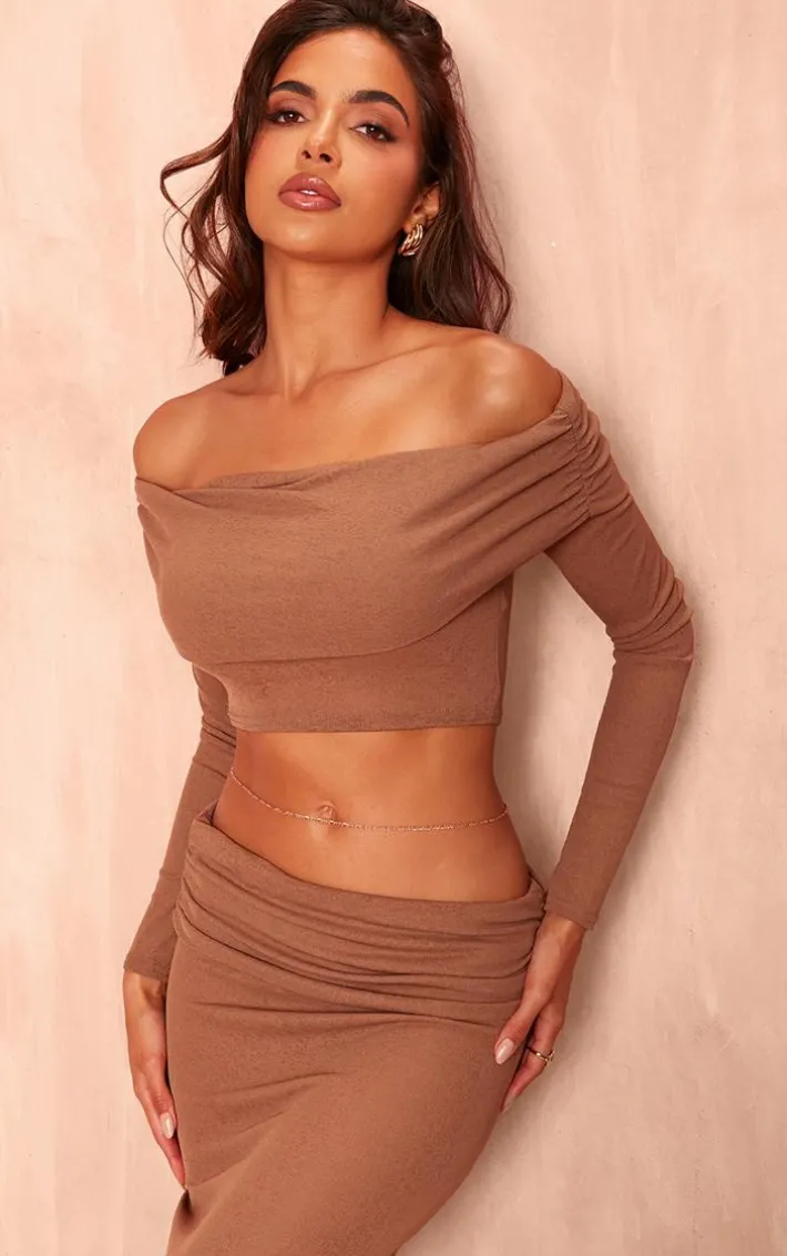 Get ready to look all kinds of luxe in this dreamy mocha sheer burnout mesh fold over hem long sleeve bardot top. With a mocha sheer burnout mesh material, a fold over hem design and long sleeves, you’ll be adding this top straight to your basket. Pair this mesh top with the matching skirt, heels and your fave accessories for a look everyone will want.
