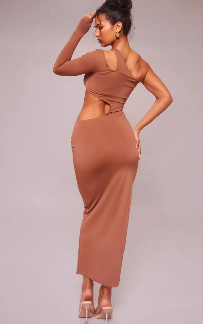 Get your glam on with this mocha slinky one sleeve cut out maxi dress. Made from a mocha slinky material with a one sleeve design and a cut out detail, you’re sure to have all eyes on you. When the weekend calls so does this maxi dress. So what are you waiting for? Shop the look and opt for your fave heels and accessories. It’s a yes from us.