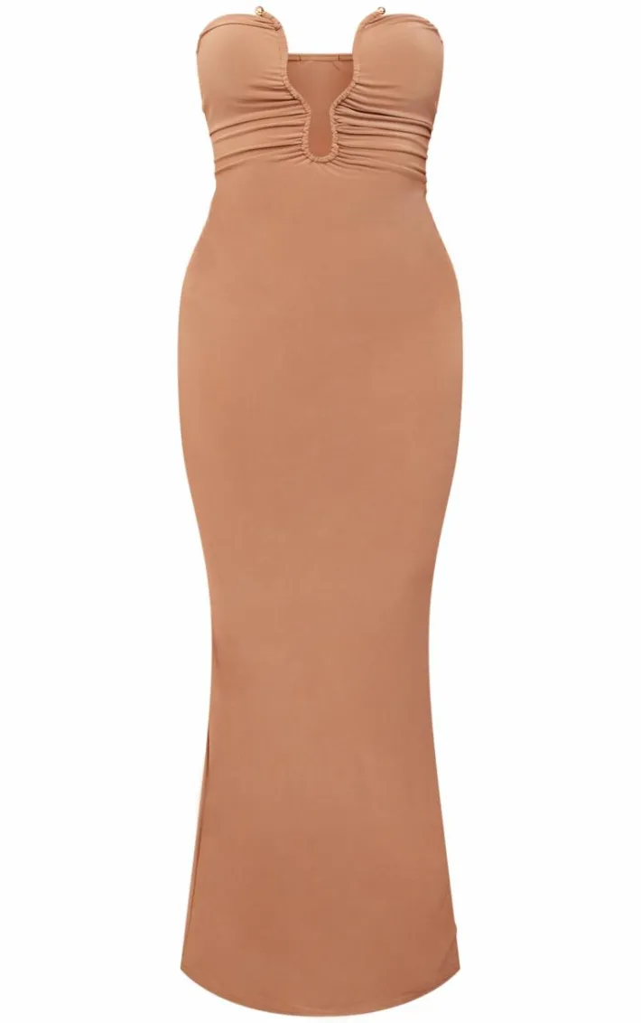 Steal the stares for all the right reasons with this mocha soft touch plunge trim detail bandeau maxi dress. Brought to you in a mocha soft touch material with a bandeau design, a plunging neckline and trim detailing, how can you say no? Seriously chic and in a figure-worshipping maxi fit, you won’t be forgotten in this mocha dress. Just add heels and accessories to elevate the look.
