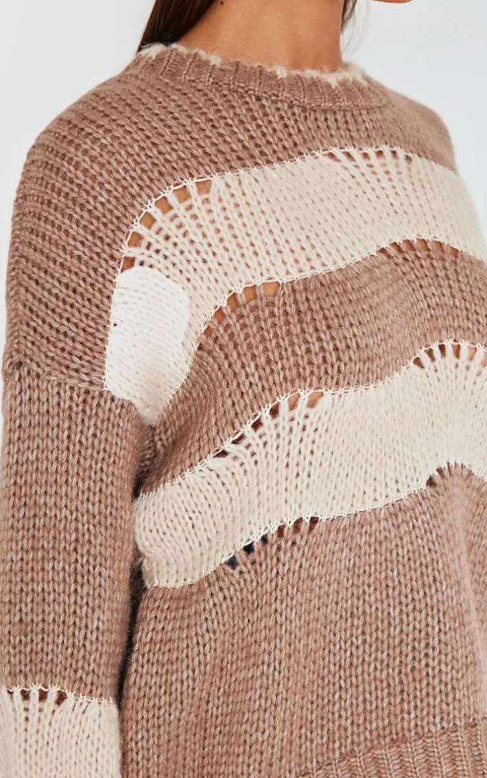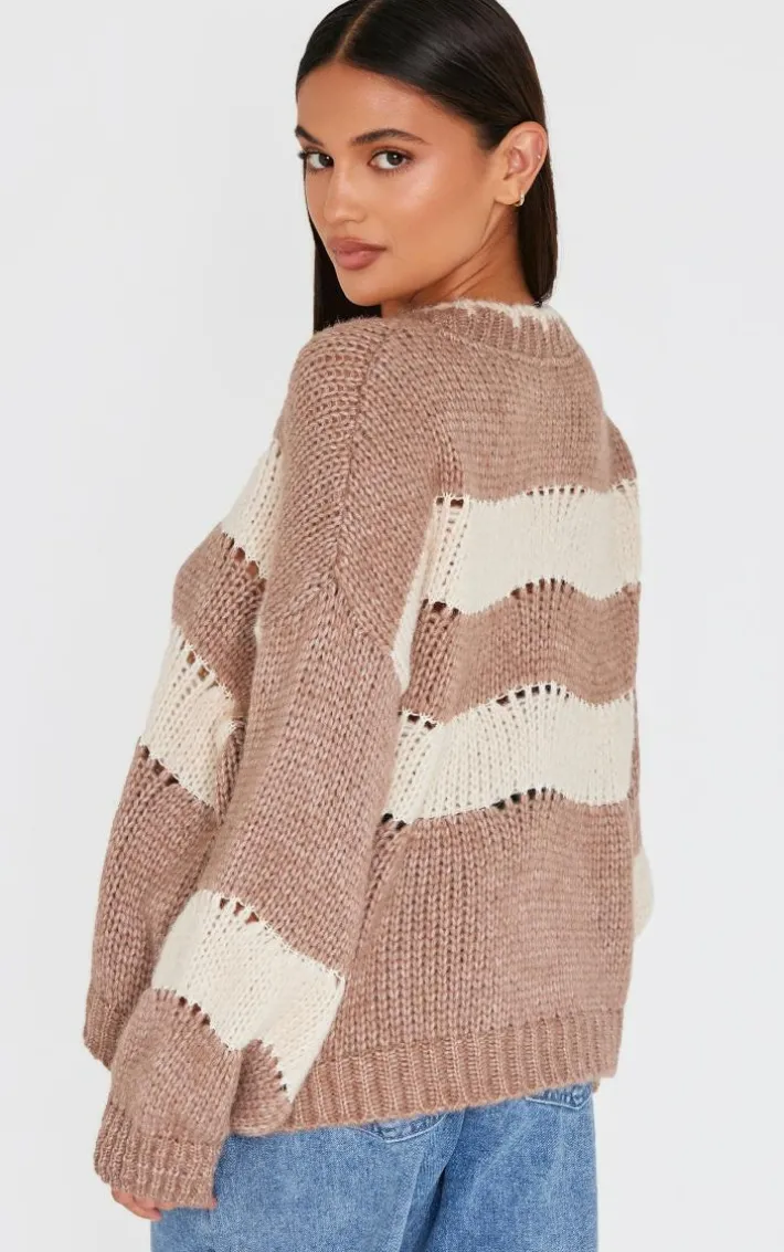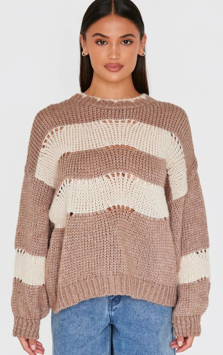 Add a touch of edge to your look with this mocha stripe distressed detail chunky knit sweater. Brought to you in a seasonal mocha hue, with a luxe stripe design, distressed detail and cosy chunky knit material, this sweater is sure to be your next go-to. Team with some simple accessories and a pair of jeans to really make an impact.