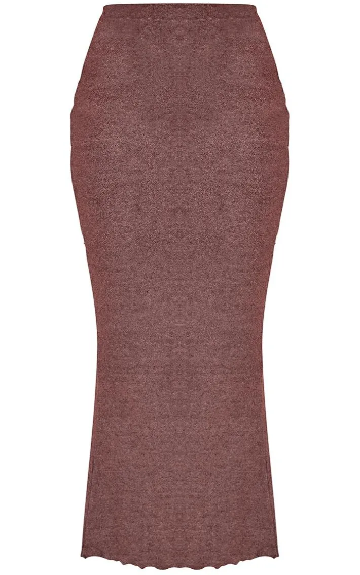 Add some seriously chic vibes to your new season wardrobe with this skirt. Featuring a mocha towelled material with a midaxi length and a figure-hugging fit. Wear with a crop top and slides for a look that we are loving.