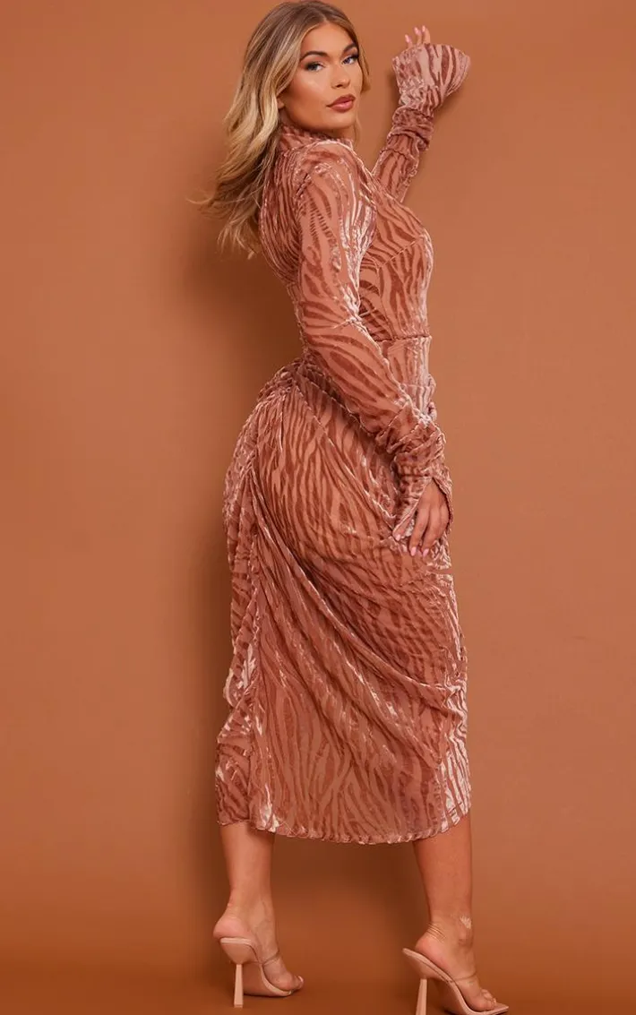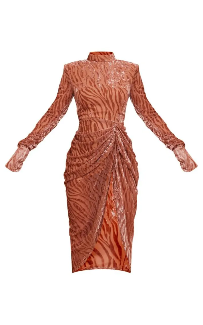 This dress is all you need to put together the ultimate outfit. Featuring a mocha hue zebra devore material with a high neckline, a draped design and a midi length, we are obsessed. All you need to complete the look are heels and accessories.