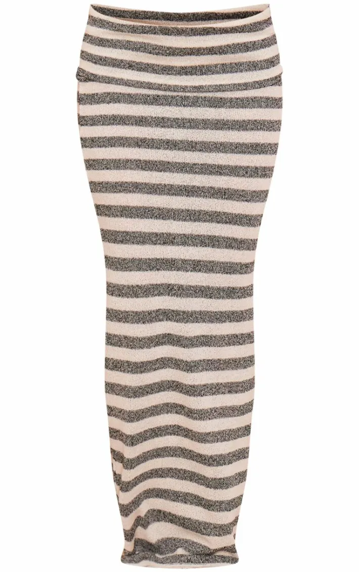 Go for all the effortlessly luxe vibes this season with this monochrome knitted stripe foldover waistband low rise maxi skirt. Made using a monochrome knitted stripe material with a foldover waistband and a low rise design, this skirt is here to help show off your confident side. Just add the matching top, platform sandals and simple accessories for a combo we’re crushing on.