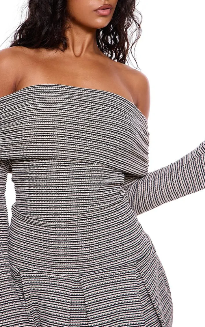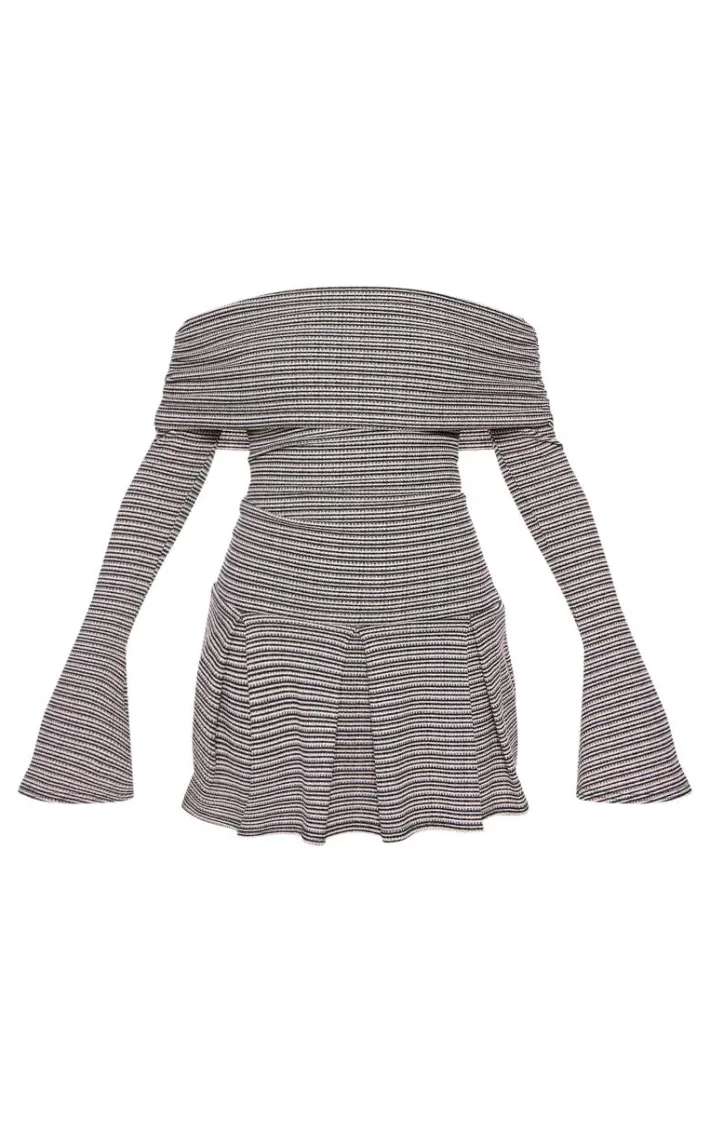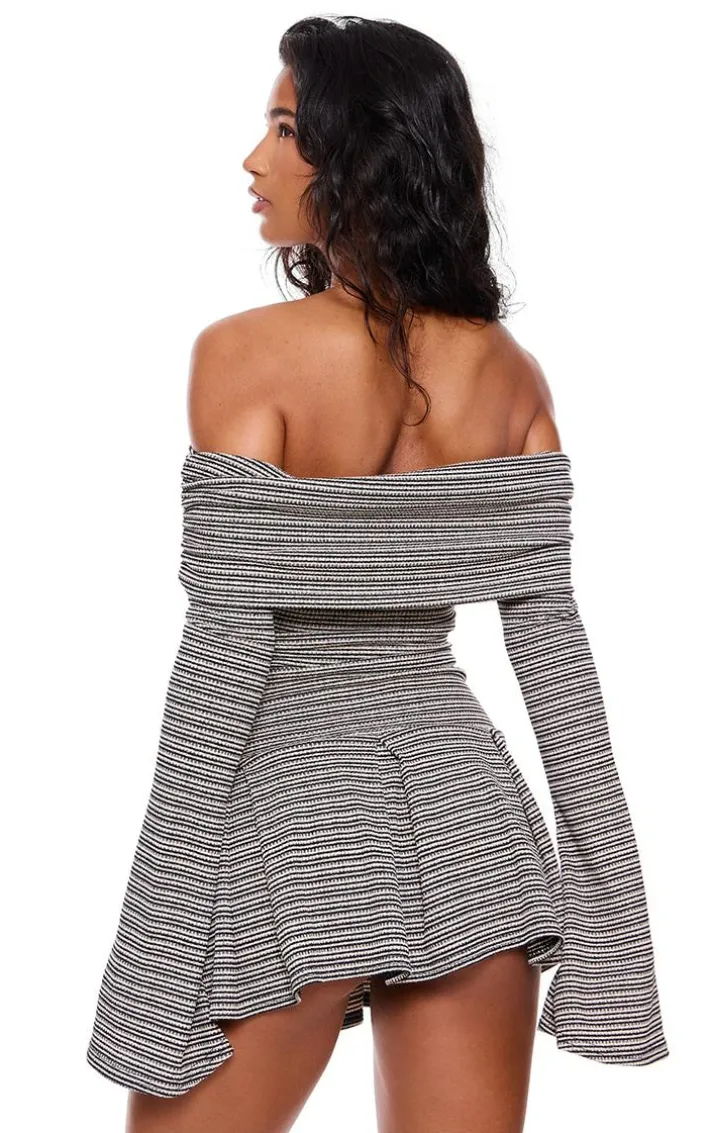 Amp up your new season wardrobe with this monochrome textured bardot flared sleeve shift dress. Brought to you in a monochrome hue textured material with a bardot neckline and flared sleeve design, this shift dress is a must have. Style with chunky loafers, knee length stockings and simple accessories for a chic finish we can’t take our eyes off.