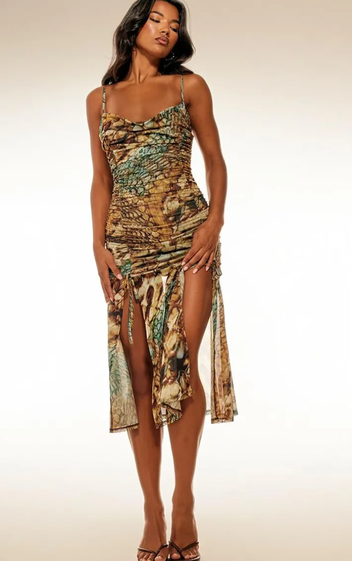 Inject some statement prints into your weekend look with this multi abstract snake print double layer mesh cowl midi dress. Brought to you in a multi hue double layer mesh material with an abstract snake print design a cowl neckline and a flattering midi fit, we are obsessed. Style this midi dress with heels and gold accessories for a look that will make you stand out from the rest.