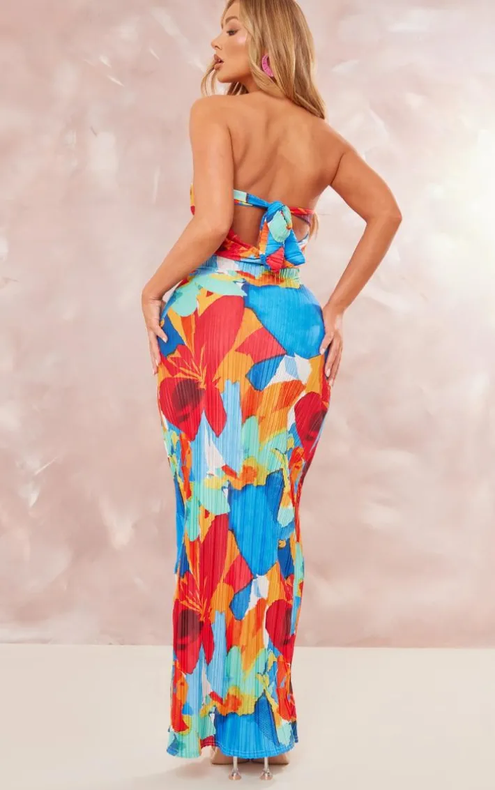 Get ready to show off your glow in this dreamy multi floral abstract print plisse bandeau cowl back maxi dress, you’re sure to have heads turning for all the right reasons. This dress features a floral abstract print plisse material with a cowl back design and a bandeau style, how could you resist ? Pair this maxi dress with clear slip-on heels and a mini bag for a look everyone will remember.