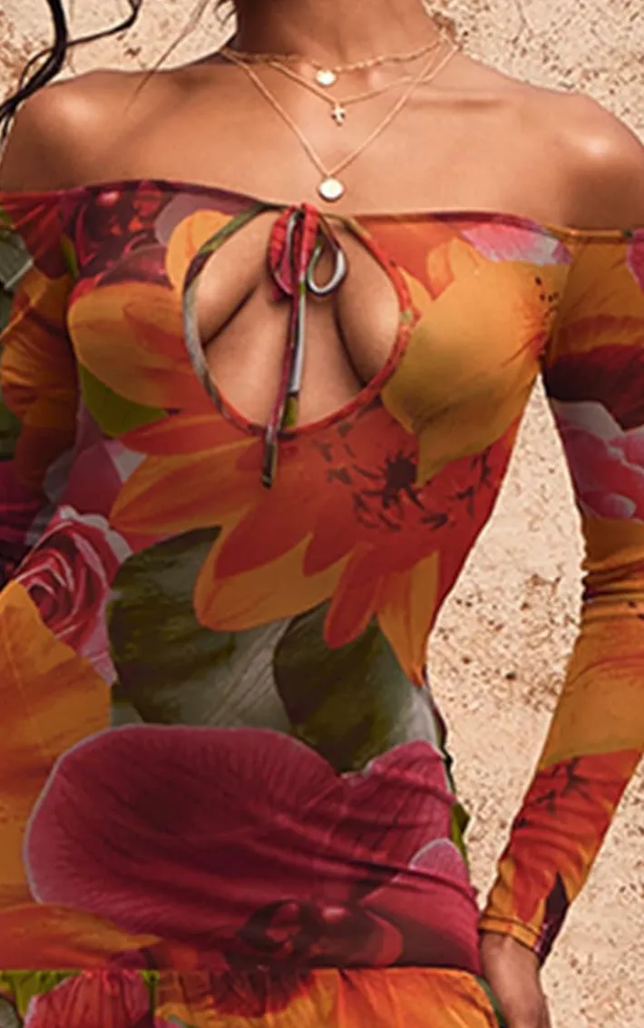 Get ready to be at the center of attention in this dreamy multi floral printed mesh tie front plunge bodycon dress. With a multi floral printed mesh material, a tie front design and a plunging neckline, you’ll be adding this bodycon dress straight to your basket. Pair with heels and your fave accessories for a flawless finish.